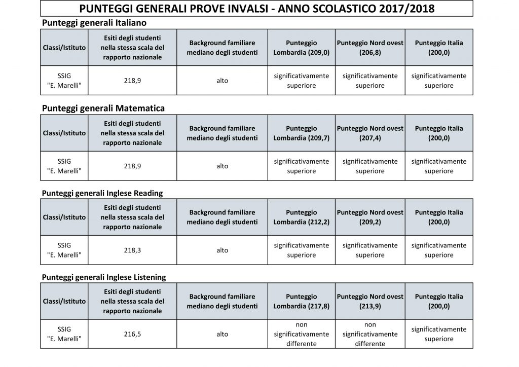 Gli esiti delle Prove Invalsi svoltesi lo scorso anno scolastico alla Scuola Secondaria di Primo Grado “Marelli” danno risultati ottimi per i nostri allievi