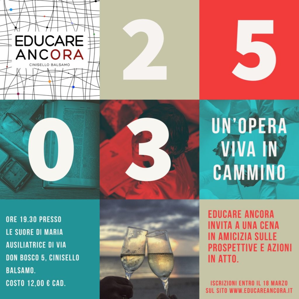 Chi ha aderito al manifesto di “Educare ancora” è invitato a partecipare alla cena che si terrà lunedì 25 marzo 2019 alle ore 19,30, a Cinisello Balsamo in via San Giovanni Bosco, 5 presso la scuola dell’infanzia e primaria delle Suore di Maria Ausiliatrice.