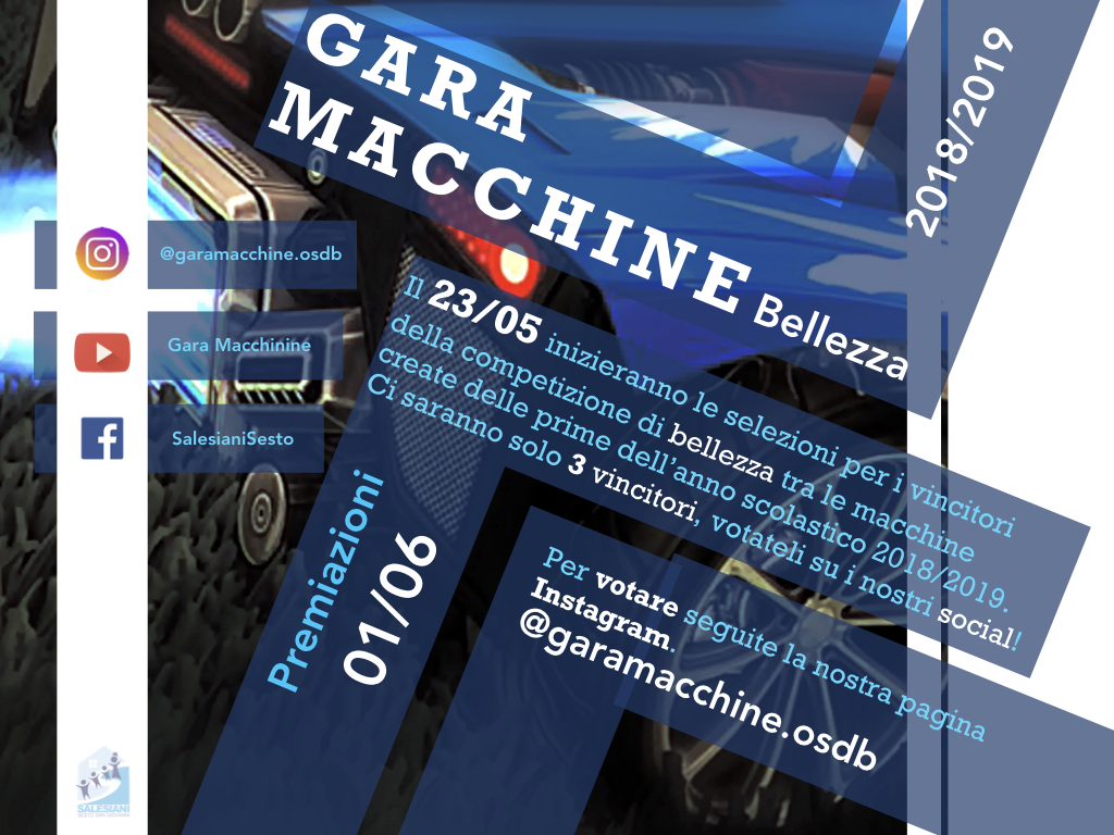 Da oggi sul profilo Facebook Salesiani Sesto oppure sul profilo Instagram Garamacchinine.osdb è possibile partecipare alle votazioni per la gara di bellezza tra le macchinine realizzate dagli allievi delle Prime dell’Istituto Tecnico Tecnologico Breda. Oltre alla gara di bellezza (saranno le premiate le prime tre macchinine che avranno ricevuto più “like”) sabato 1° giugno si correranno le gare a eliminazione diretta per decretare la macchinina più performante. Continuate a seguirci!