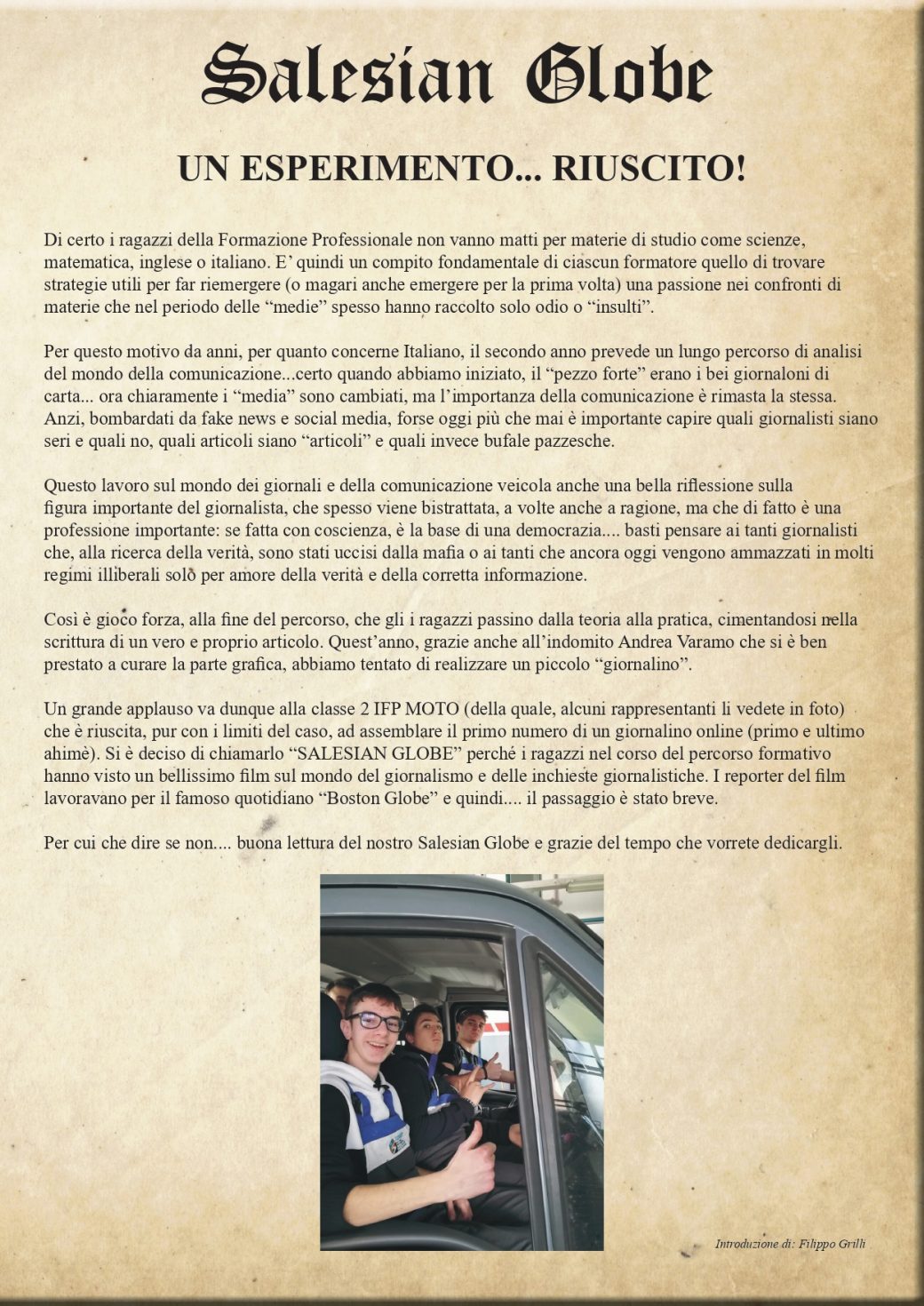 Di certo i ragazzi della Formazione Professionale non vanno matti per materie di studio come scienze, matematica, inglese o italiano. E’ quindi un compito fondamentale di ciascun formatore quello di trovare strategie utili per far riemergere (o magari anche emergere per la prima volta) una passione nei confronti di materie che nel periodo delle “medie” spesso hanno raccolto solo odio o “insulti”. Per questo motivo da anni, per quanto concerne Italiano, il secondo anno prevede un lungo percorso di analisi del mondo della comunicazione… Certo quando abbiamo iniziato, il “pezzo forte” erano i bei quotidiani di carta… Ora chiaramente i “media” sono cambiati, ma l’importanza della comunicazione è rimasta la stessa. Anzi, bombardati da fake news e social media, forse oggi più che mai è importante capire quali giornalisti siano seri e quali no, quali articoli siano “articoli” e quali invece bufale pazzesche. Questo lavoro sul mondo dei giornali e della comunicazione veicola anche una bella riflessione sulla figura importante del giornalista, che spesso viene bistrattata, a volte anche a ragione, ma che di fatto è una professione importante: se fatta con coscienza, è la base di una democrazia. Basti pensare ai tanti giornalisti che, alla ricerca della verità, sono stati uccisi dalla mafia o ai tanti che ancora oggi vengono ammazzati in molti regimi illiberali solo per amore della verità e della corretta informazione. Così è gioco forza, alla fine del percorso, che gli i ragazzi passino dalla teoria alla pratica, cimentandosi nella scrittura di un vero e proprio articolo. Quest’anno, grazie anche all’indomito Andrea Varamo (giovane in Servizio Civile presso le Opere Sociali Don Bosco) che si è ben prestato a curare la parte grafica, abbiamo tentato di realizzare un piccolo “giornalino”. Un grande applauso va dunque alla classe 2 IFP MOTO (della quale, alcuni rappresentanti li vedete in foto) che è riuscita, pur con i limiti del caso, ad assemblare il primo numero di un giornalino online (primo e ultimo ahimè). Si è deciso di chiamarlo “SALESIAN GLOBE” perché i ragazzi nel corso del percorso formativo hanno visto un bellissimo film sul mondo del giornalismo e delle inchieste giornalistiche. I reporter del film lavoravano per il famoso quotidiano “Boston Globe” e quindi il passaggio è stato breve.