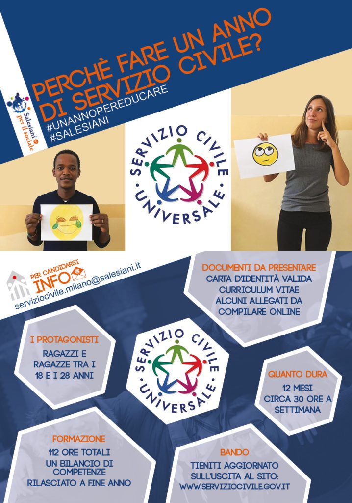 La segreteria di SC è operativa per la compilazione guidata tramite appuntamento (o presso gli uffici o telefonicamente al 338.39.53.124). Per prendere appuntamento scrivere a serviziocivile.milano@salesiani.it oppure chiamare 02.67827526 oppure 338.39.53.124.