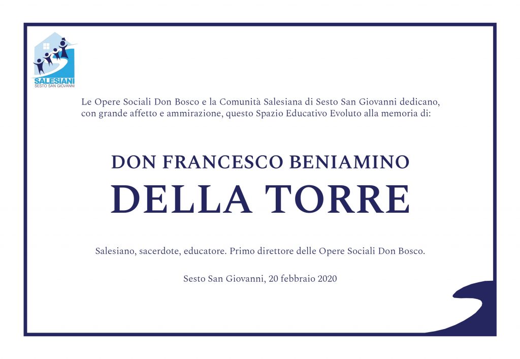 Lo scorso 20 febbraio, nell’ambito dell’evento che ha sancito l’attribuzione alle Opere Sociali Don Bosco della certificazione di Apple Distinguished School, è stata intitolata la nuova e attrezzata aula dello Spazio Educativo Evoluto a don Francesco Beniamino Della Torre. Don Della Torre fu il primo Direttore delle Opere Sociali Don Bosco inviato a Sesto assieme a un manipolo di salesiani pionieri dall’allora Arcivescovo di Milano Cardinal Alfredo Ildefonso Schuster (che, tra l’altro, dà il nome al Palazzo Schuster in cui è inserita l’aula stessa).