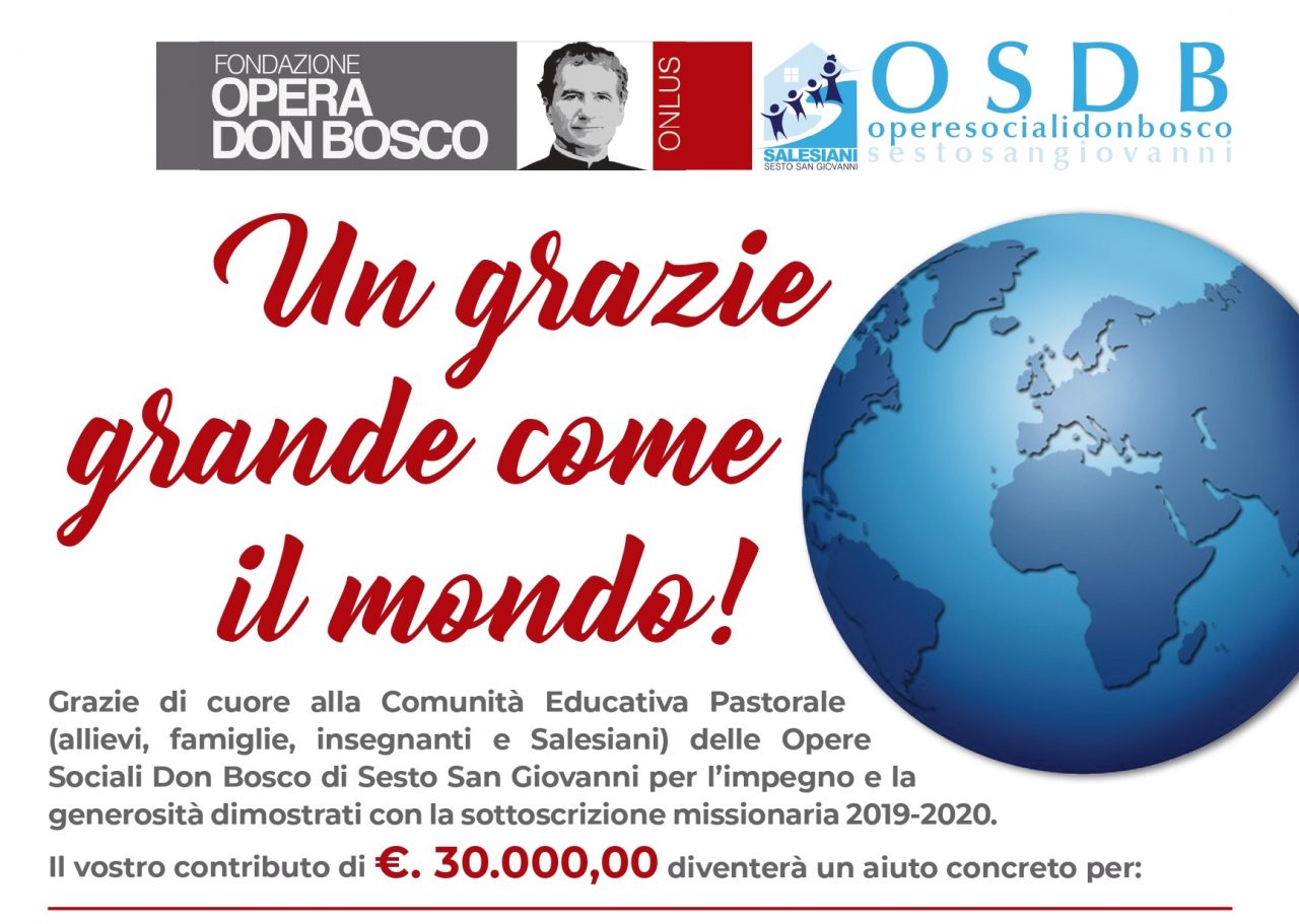 a nome della Fondazione Opera Don Bosco desidero ringraziare tutta la Comunità Educativa Pastorale (allievi, famiglie, insegnanti e Salesiani) delle Opere Sociali Don Bosco per la significativa offerta di € 30.000,00, segno del vostro impegno e della vostra generosità.
