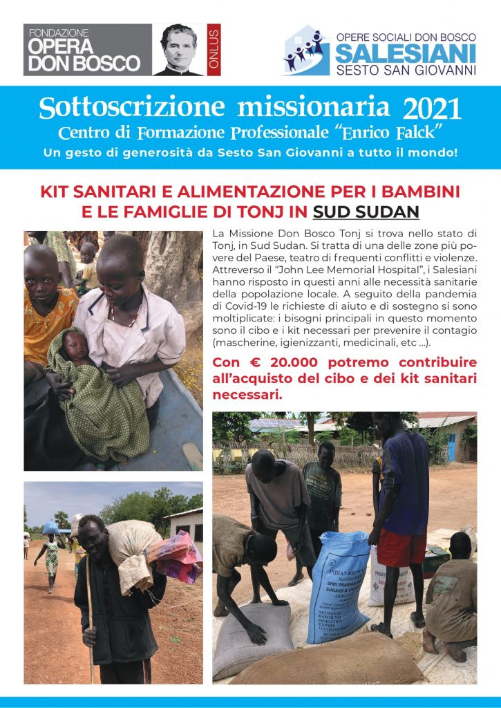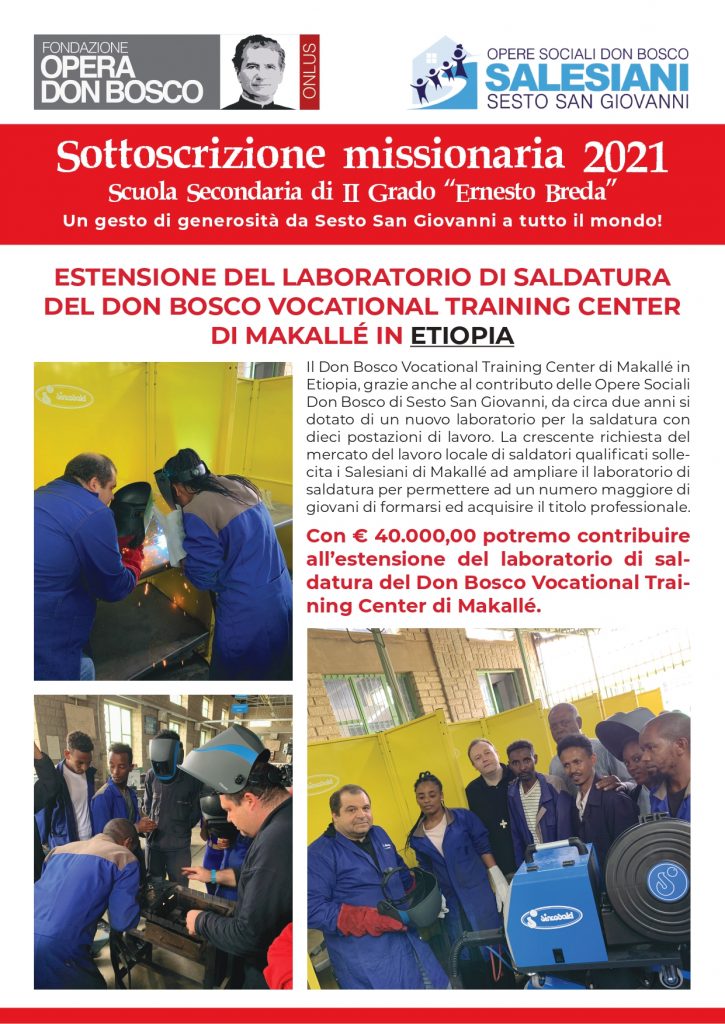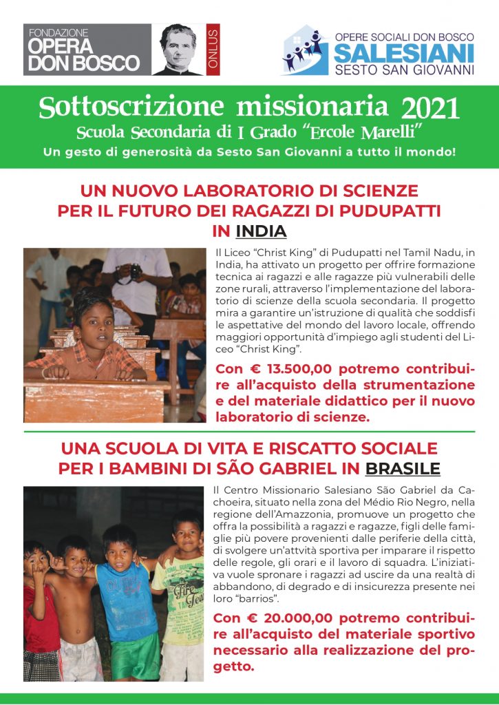 Con la Sottoscrizione Missionaria 2021 ciascun settore delle Opere Sociali Don Bosco (Scuola Secondaria di Primo Grado “MARELLI”, Scuola Secondaria di Secondo Grado “BREDA”, Centro di Formazione Professionale “FALCK”) ha potuto sostenere i progetti che gli sono affidati dalla Fondazione Opera Don Bosco Onlus attraverso l’acquisto e la vendita di biglietti. Un gesto di generosità da Sesto San Giovanni a tutto il mondo!