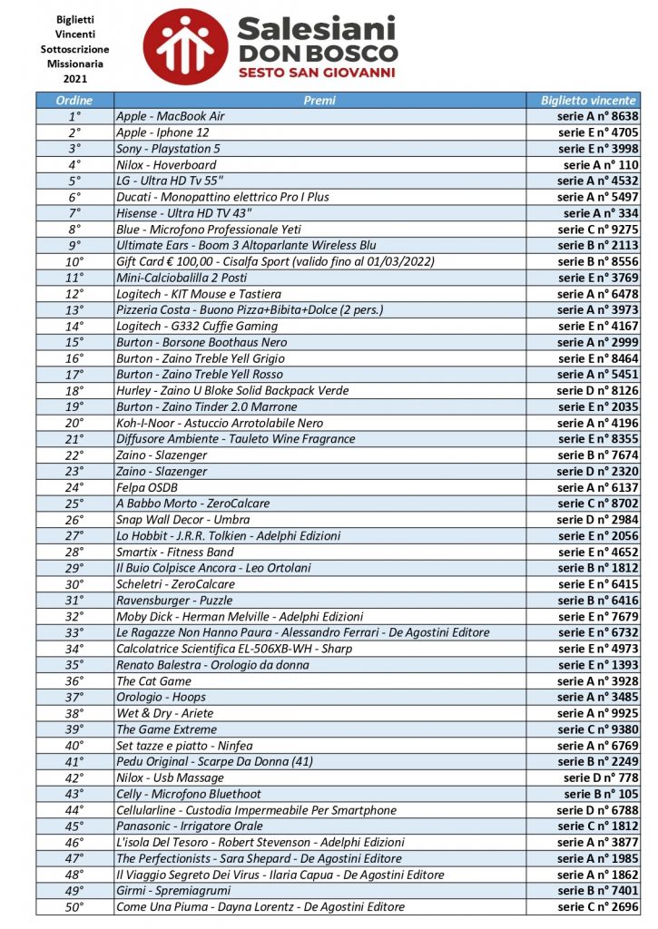 I possessori dei biglietti vincenti possono richiedere il proprio premio rivolgendosi all’Ufficio Acquisti delle Opere Sociali Don Bosco: tel. 02.26.29.21 e-mail acquisti@salesianisesto.it