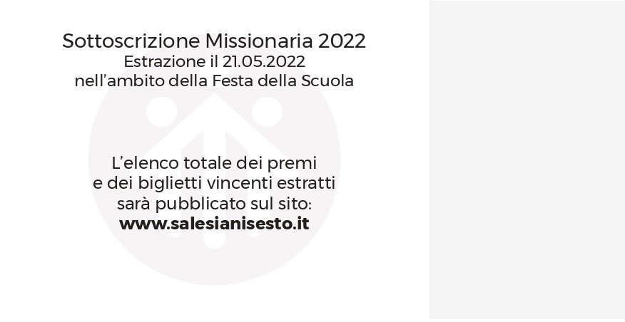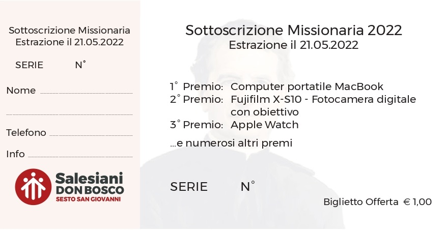 Come tradizione la Sottoscrizione Missionaria coinvolge tutti i giovani iscritti presso le nostre scuole in una sfida di generosità e di solidarietà. La vendita e l’acquisto dei biglietti (a 1,00 € cadauno) sosterrà i progetti della Fondazione Opera Don Bosco Onlus. Ciascun settore delle Opere Sociali Don Bosco sosterrà una iniziativa specifica.